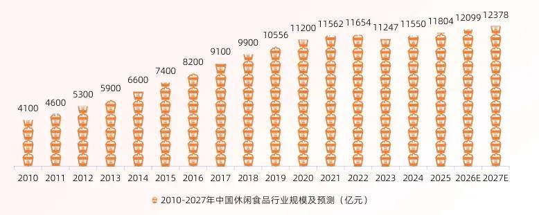 2024年中国社会消费品零售总额达48。3万亿元,同比增加3。4%,消费市场稳步苏醒。正在此布景下,休闲食物行业也连结增加态势,2025年市场规模估计达11804亿元,2027年无望增至12378亿元。休闲食物已成为公共日常消费的主要构成部门,刚需、情感驱动等特征。