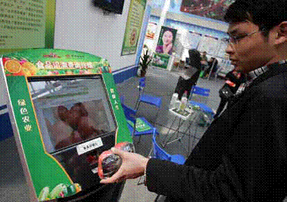 第十六届西洽会安徽展区内,一名工做人员将贴有指定标签包拆好的蔬菜正在“食物逃溯查询终端”系统上一扫,屏幕上当即显示出蔬菜的名称、编号、产地、农药残留检测成果和发卖地址等多种消息。图/CFP。